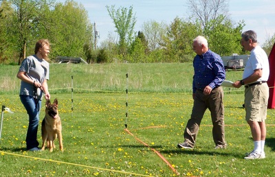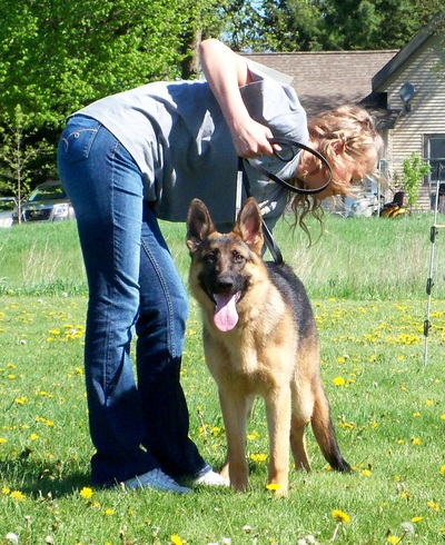 Very nice female here. The dentition is correct, the dog has all the 42 teeth, and has a scissor bite. A female of good size, she will be of upper medium size when she is fully grown. She is very firm and dry, she has a good wither, firm back, good position of the croup which could be a little bit longer. She has good angulation in the front and very good angulation in the rear. And with ongoing movement, she moves better and better. So with more training in this dog, she will do very well in the ring because she has a very good front reach and a good, effective rear drive. She has good chest proportions, and the eyes could be a little bit darker. But it is the way it is. But it is not a critical factor but I need to mention this. In the future when this dog eventually comes into the breeding program, we should select males for her with darker eyes, and with the darker pigment so we be a little bit better.
