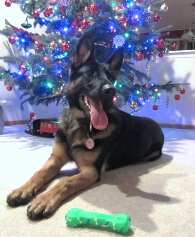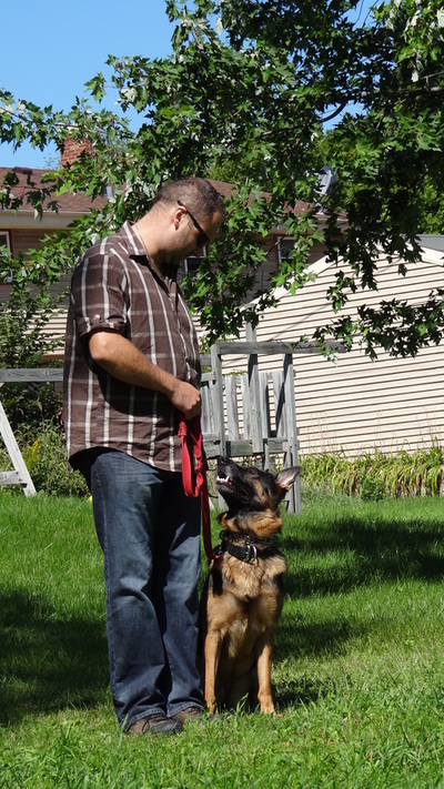 Carmela is a house dog who is owned by a family with a young boy living in SE Wisconsin. Carmela is a medium sized female with great expression. She is black and red with a dark mask and dark brown eyes. She has a high withers, a firm back, and has a good position and length of the croup. Carmela has very good angulation in the front and good angulation in the rear. She has correct chest proportions. She is correct in coming and going, and shows good gait from the side.