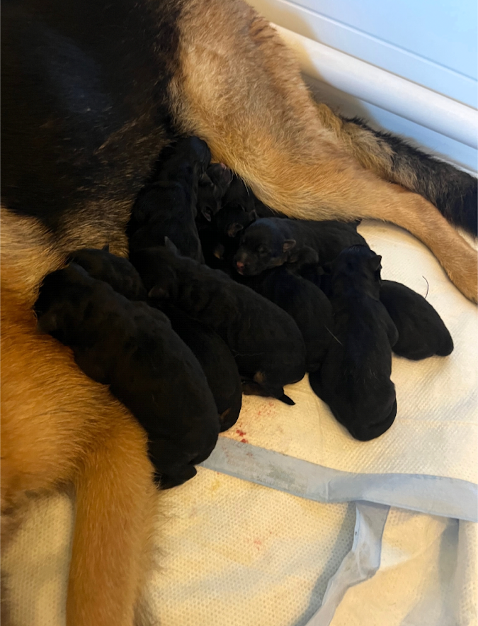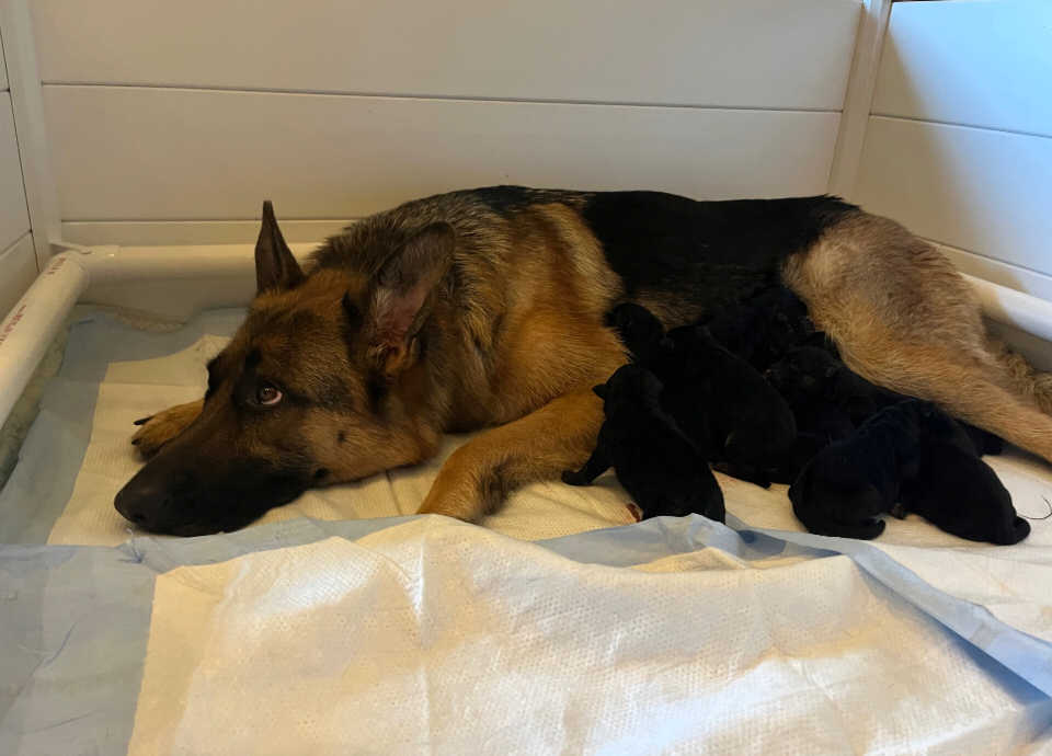 From this litter we expect large bone pups with strong nerves and exceptional health. Some of the pups are solid black and some of the pups are black and red saddle puppies.