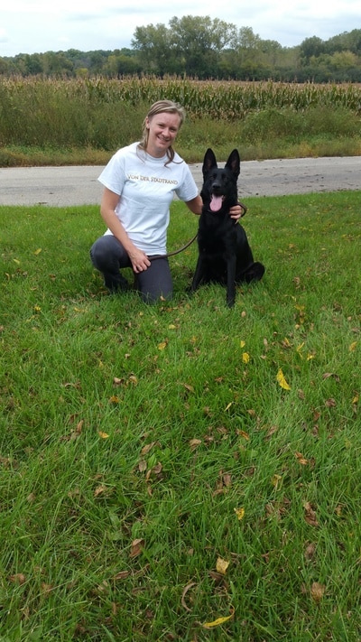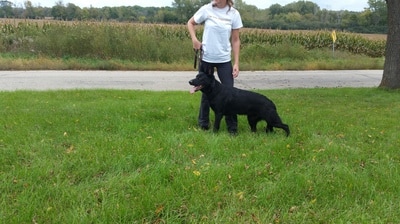 Elle lives with a family in south central Wisconsin. Elle is a medium sized solid black female. She is very expressive and has dark eyes and strong ears. Elle has high withers a long firm back with a correct croup and a long tail. Elle is correct coming and going with good front reach and powerful rear drive.