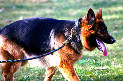 Jäger is a house dog who is owned and handled by a woman living in SE Wisconsin. Jäger is an over medium sized rich black and red male. He is very masculine in appearance and has a robust chest. Jäger has a dark mask and dark eyes. He has a high withers, a firm back, and has a good position and length of the croup. Jäger has very good angulation in the front and good angulation in the rear. He is correct in coming and going, and shows good gait from the side.