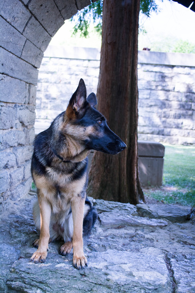 Lilly and her Chihuahua "brother" live with a family in SE Wisconsin. Lilly is an over medium sized black and red female. She has dark eyes with a dark mask and strong ears. Lilly has good front and rear angulation with high withers and a firm back. She is correct coming and going and shows good power from the rear.