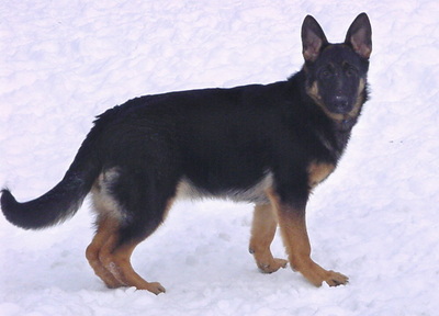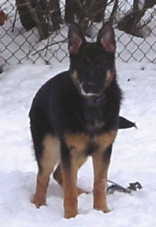 Natalie is a house dog who is owned by a family with two children living in SE Wisconsin. Natalie is a large female with a wonderful expression. She is black and red with a dark mask and dark eyes. She has a high withers, a firm back, and good position and length of the croup. Natalie has very good angulation in the front and very good angulation in the rear. She has good chest proportions. She is absolutely correct in coming and going, and shows very good gait from the side.