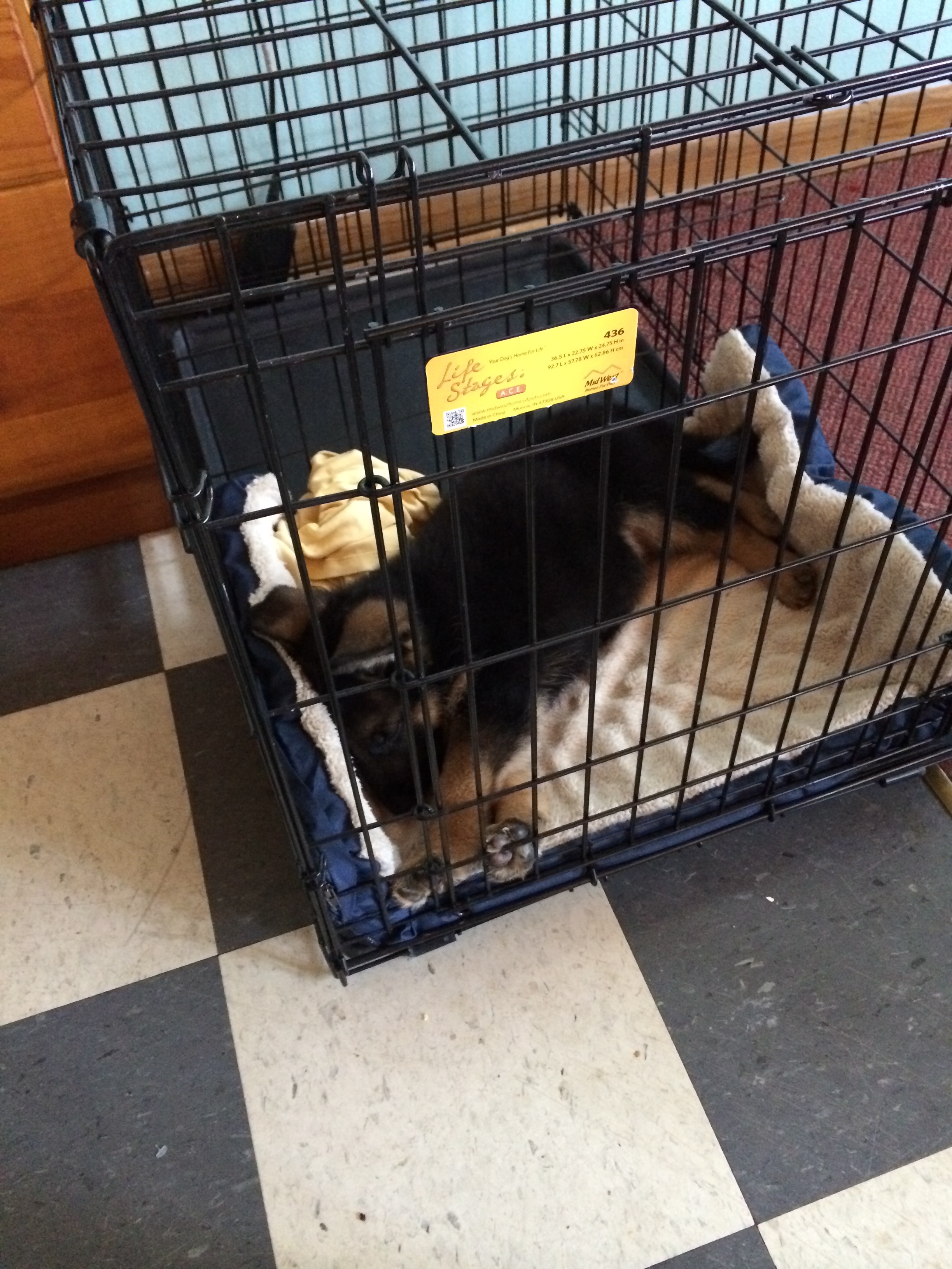We recommend that you purchase a good quality crate for your puppy. Most larger dog crates will come with a divider in it so that you can section off the crate. While your puppy is small you will want to divide the crate into a smaller area, this way puppy will feel secure inside and it will be a safe den like space for him/her. As your puppy grows, increase the area in their crate. The puppies have had experience sleeping in a crate since they were about three and a half weeks old so they understand the concept of this is where you sleep and not potty, however they were able to leave to go potty in their designated potty areas when they needed so it may take them a moment to adjust.