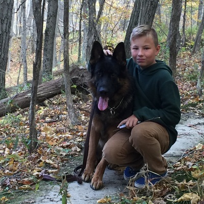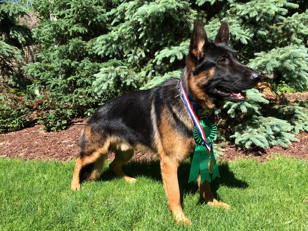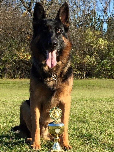 Poseidon displays perfection in both mind and body. Poseidon’s temperament is his best quality. He has strong nerves and an easy relaxed nature in all environments. He is playful with children of all ages and protective to all members of the family. Poseidon lives to please his handler. In May 2015, Poseidon earned his BH and AD (endurance test) titles. In November 2015, Poseidon earned SG, or very good which is the highest rating for his age, and second place at the 2015 North Central Regional Conformation Show.