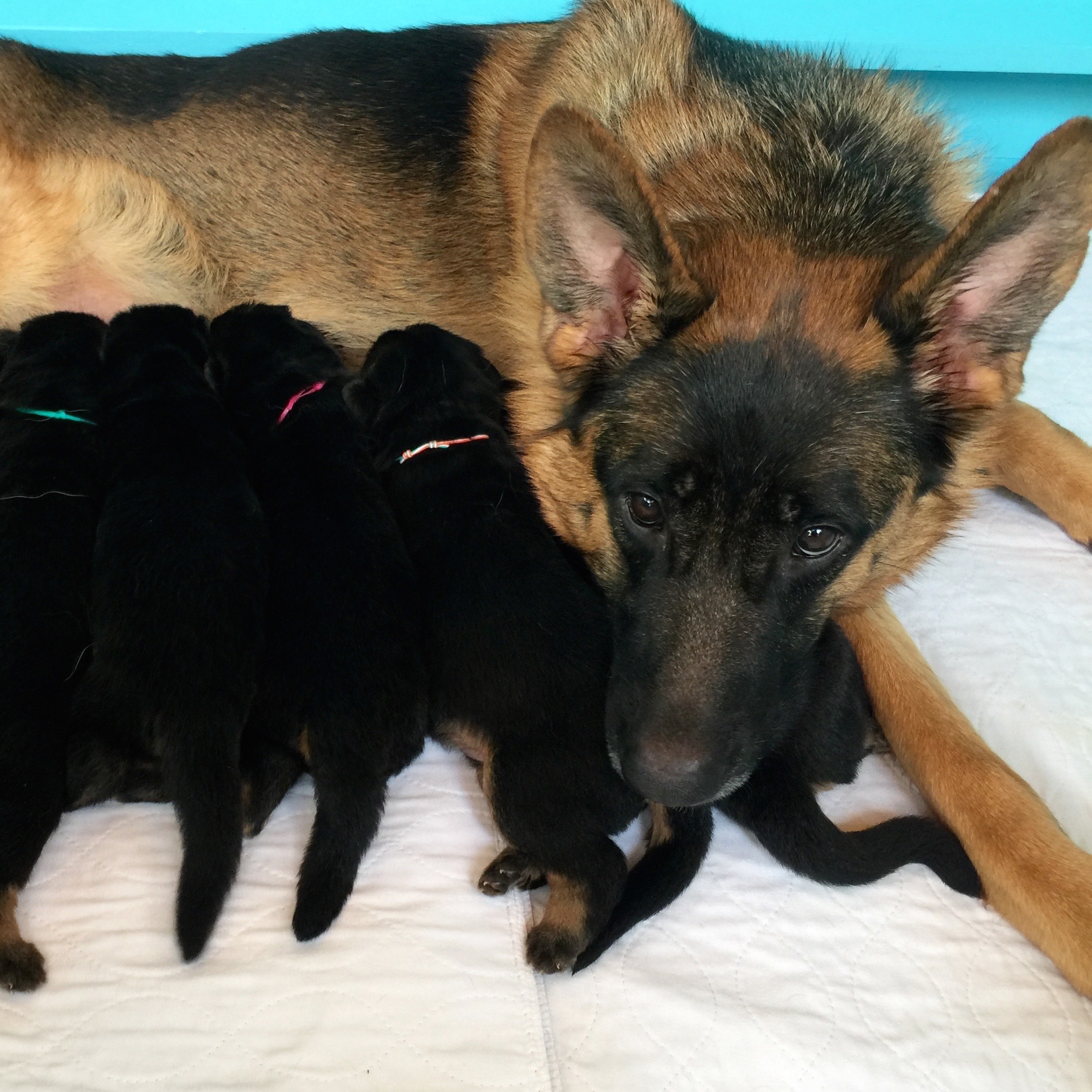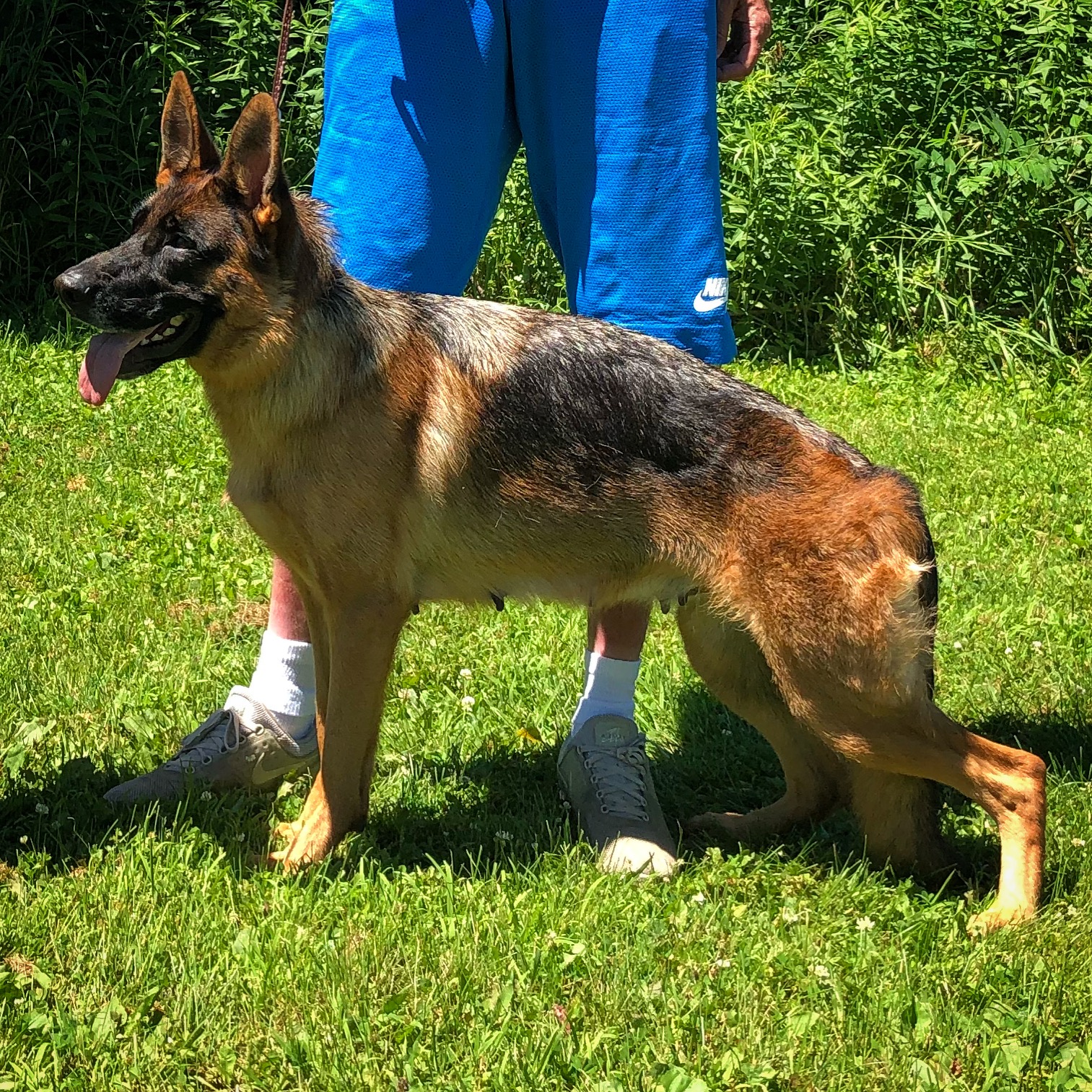 Uschi is a large black and rich red female. She has a beautiful feminine head with a dark mask and dark brown eyes. Uschi has excellent structure with beautiful expression.