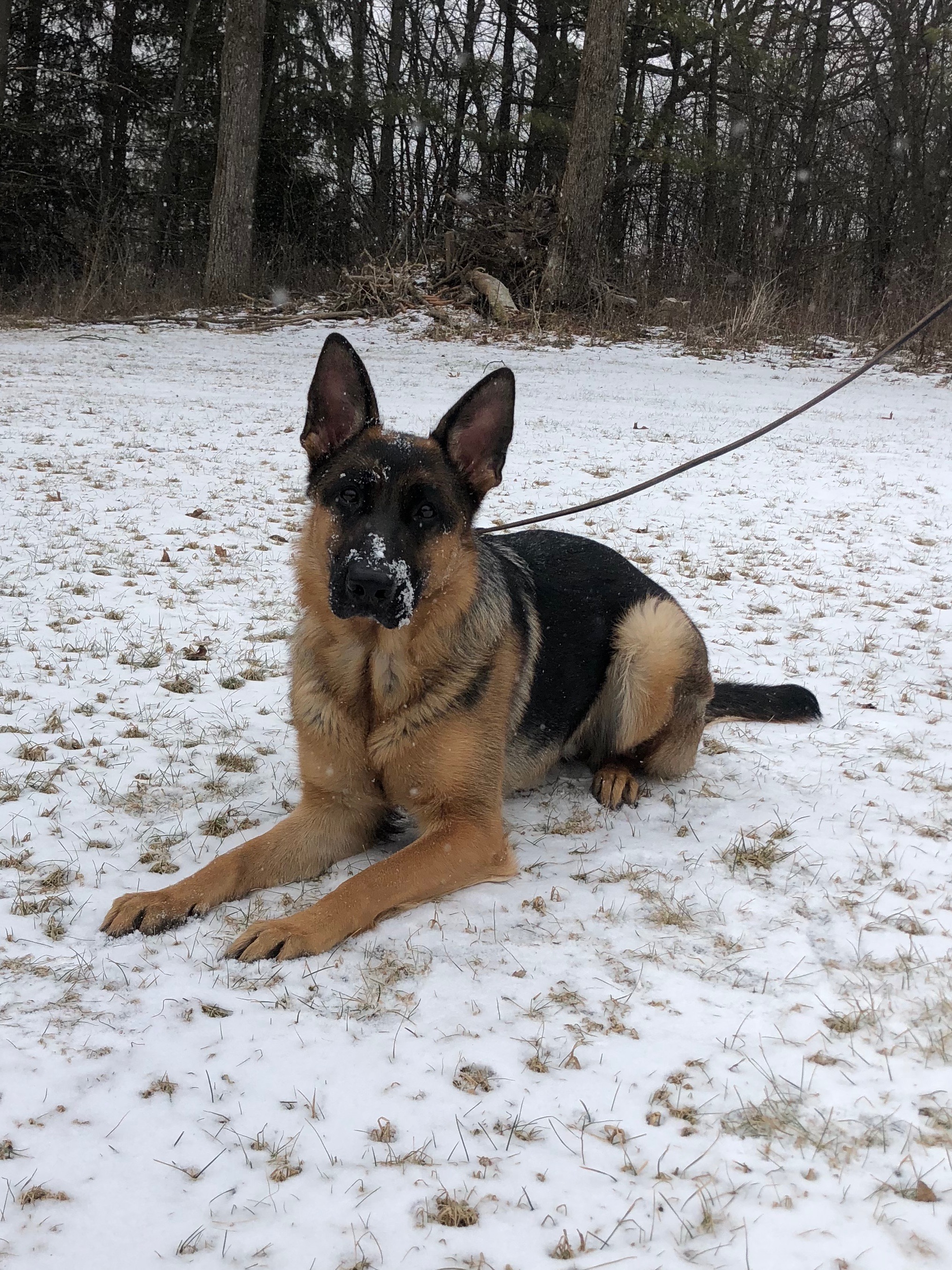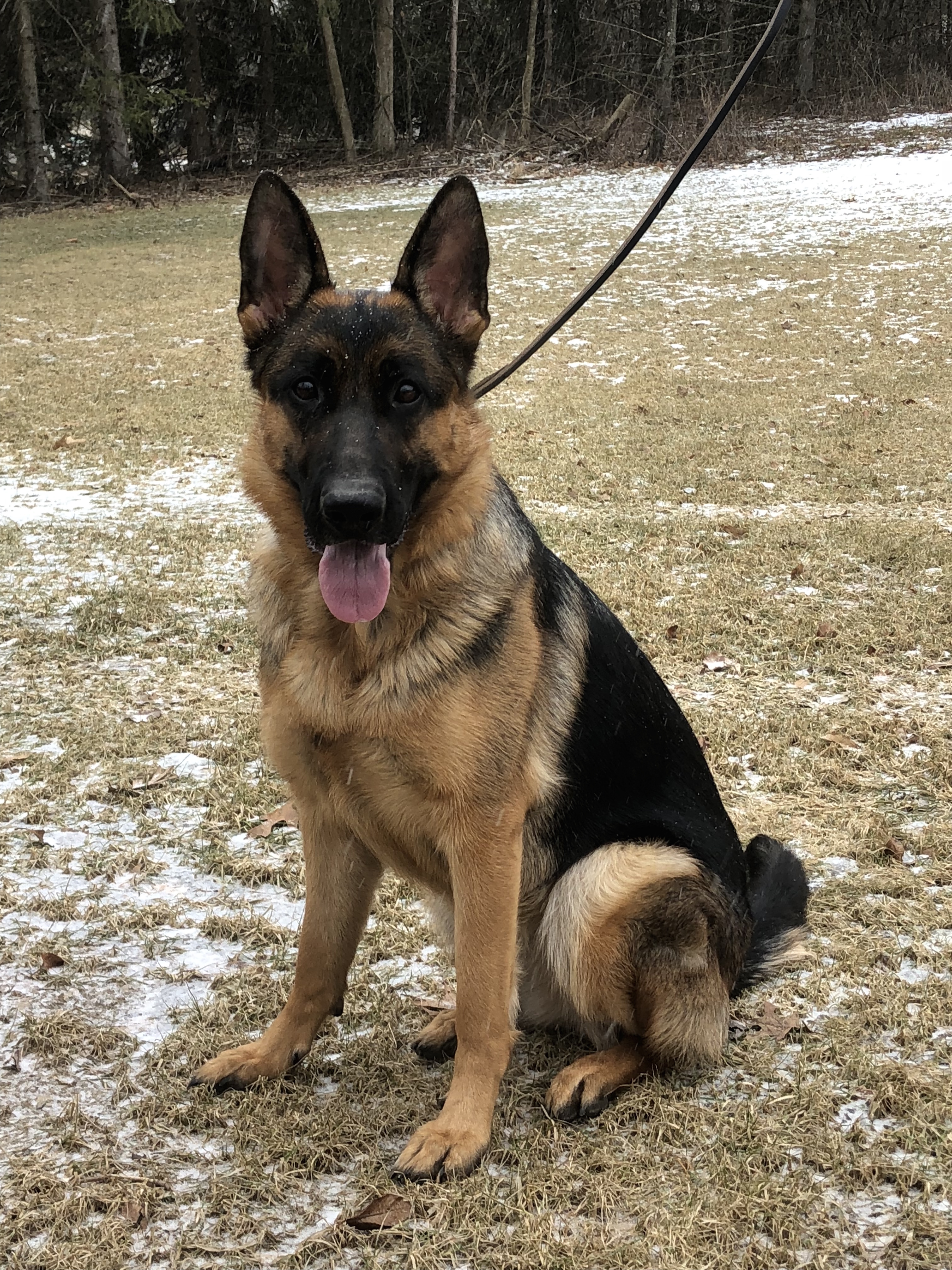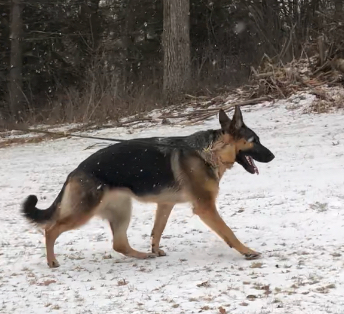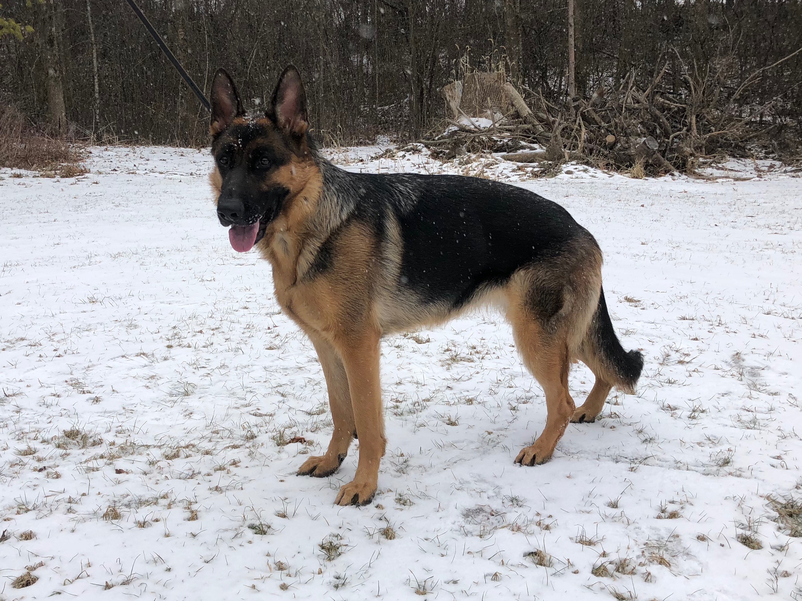 Xena is a large black and rich red female. She has a slightly masculine head with a dark mask and dark eyes. Xena has good front and rear angulation with high withers and a firm back. She is correct coming and going and shows good power from the rear.