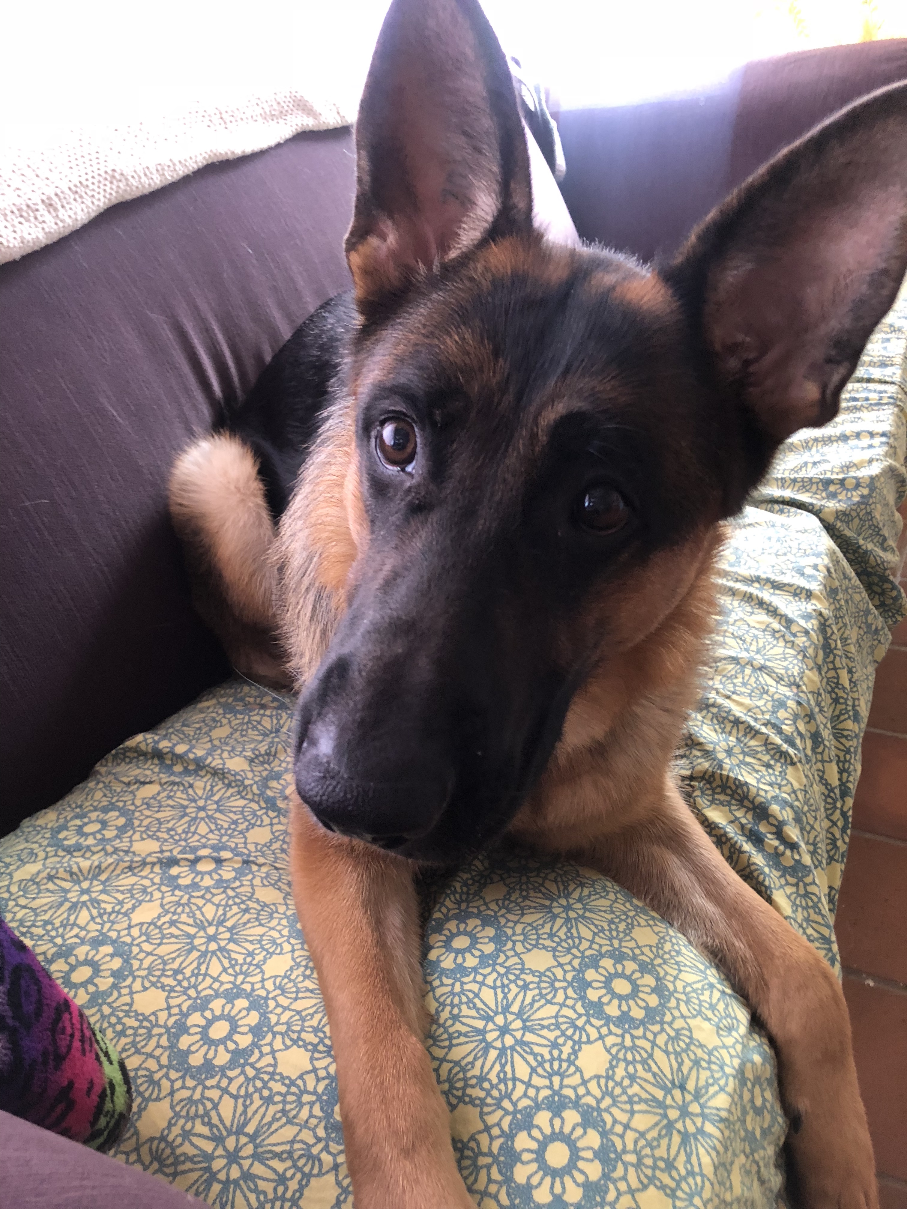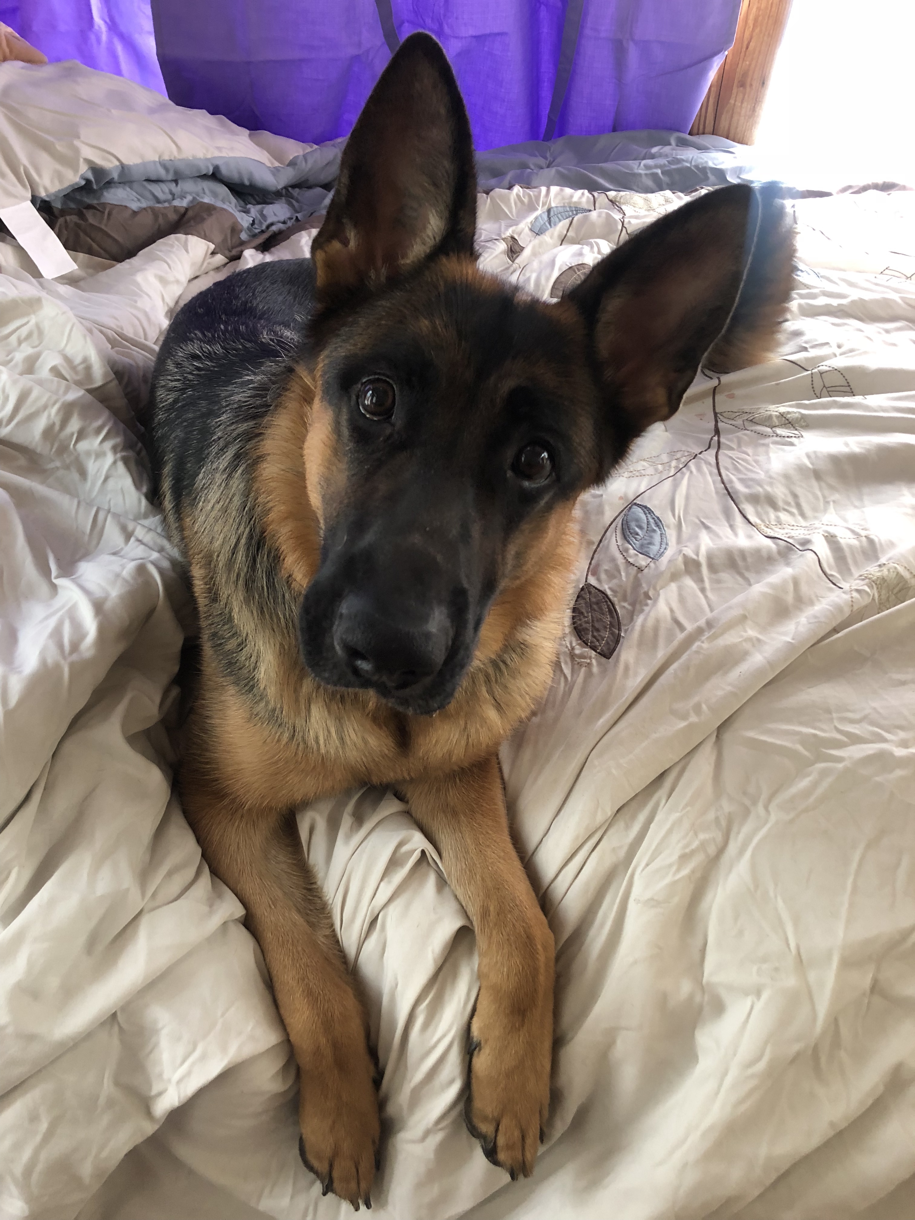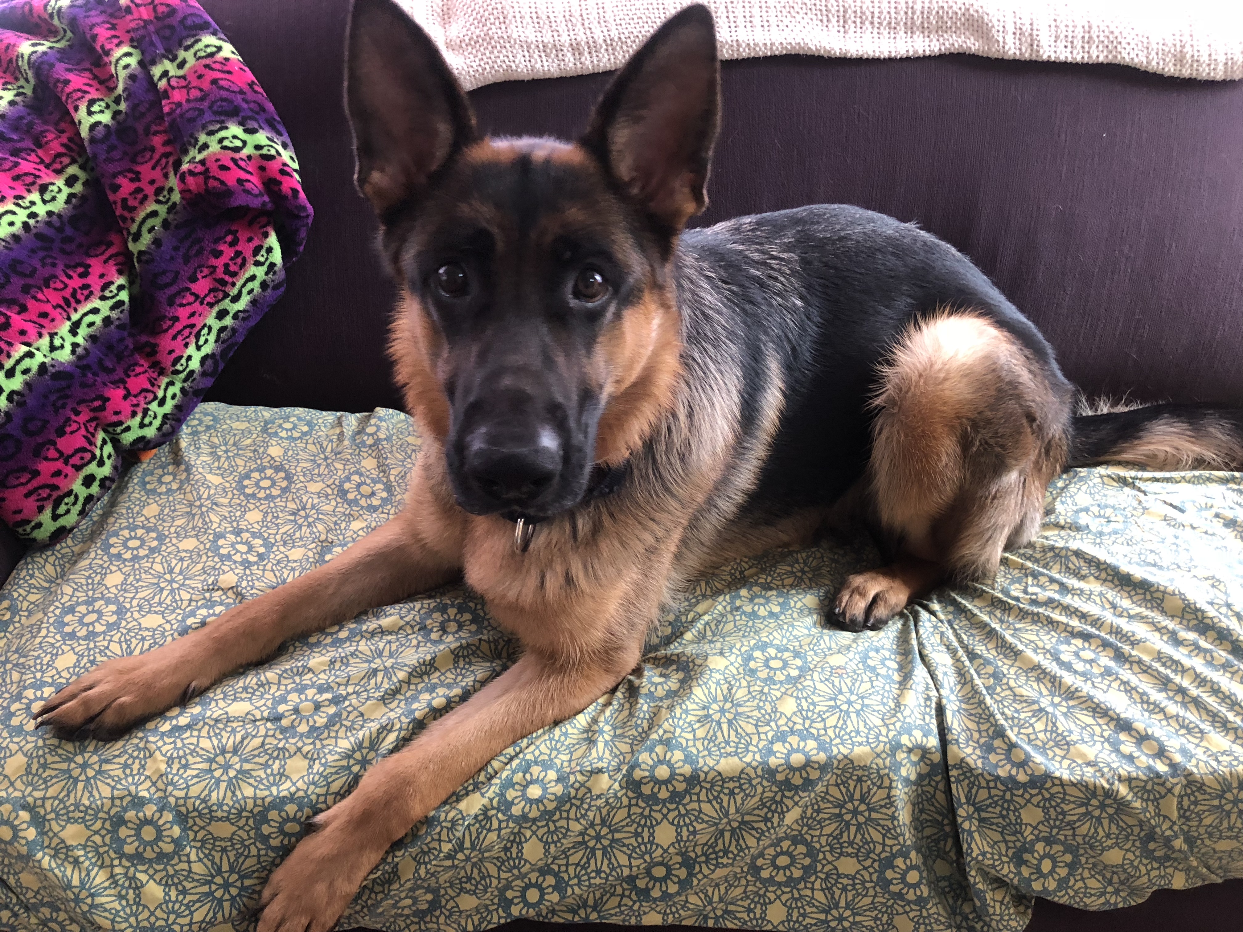 Xena is a large black and rich red female. She has a slightly masculine head with a dark mask and dark eyes. Xena has good front and rear angulation with high withers and a firm back. She is correct coming and going and shows good power from the rear.