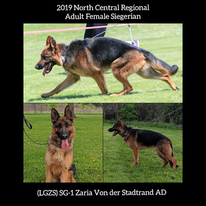 Zaria took 1st place in the Female Open Class at the 2019 North Central Regional Conformation Show and also received an SG (Very Good) rating. Zaria earned her TT (Temperament Test) and AD (endurance title) in 2019 as well.